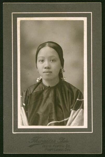 Chin Hing Qong (second from the right, third row from the bottom), Chin Quan Gue (first from the right, second row), and Mabel Chin (first from the right, third row) are part of this portraiture taken in Portland, Oregon. The identity of the rest of the members in the photograph is unknown.