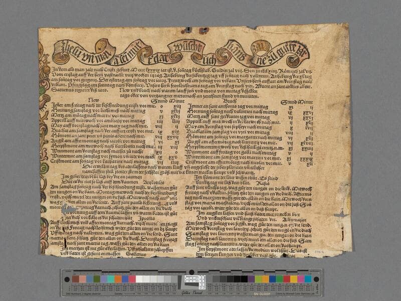 Almanac in German for 1487; includes information on when to perform bloodletting. Text begins: Im jar als man zalt nach Christi geburt M°cccc°lxxxvii° ... Woodcut banderole in top margin and woodcut border at left. Two astronomical illustrations. Imperfect: torn and repaired along previous center fold, with some loss of text. Previously mounted on a leaf.