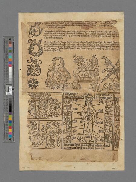 Almanac in German for 1487; includes information on when to perform bloodletting. Text begins: Im jar als man zalt nach Christi geburt M°cccc°lxxxvii° ... Woodcut banderole in top margin and woodcut border at left. Two astronomical illustrations. Imperfect: torn and repaired along previous center fold, with some loss of text. Previously mounted on a leaf.