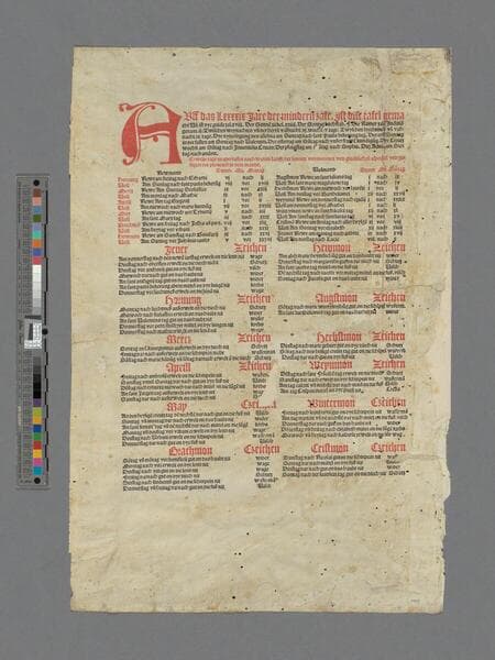 Almanac in German for Bamberg for the year 1490. Text begins: Auf das .XC. iare minder zale ist dise tafel newer vnd voller monde in der loblichen stadt Bamberg gemacht ... Printed in red and black. Woodcut border along top and left edges; red woodcut initial at beginning of text; two woodcuts of eclipses in bottom margin. Imperfect: first 40 lines out of 71 lines only; torn and repaired, with some loss of text and woodcut border.