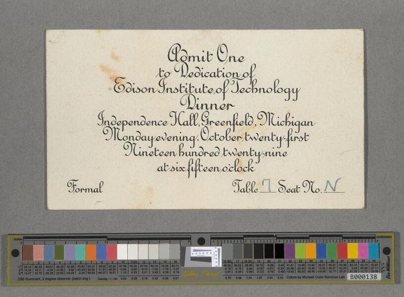 Admit one ticket to the dedication of Edison Institute of Technology dinner, verso