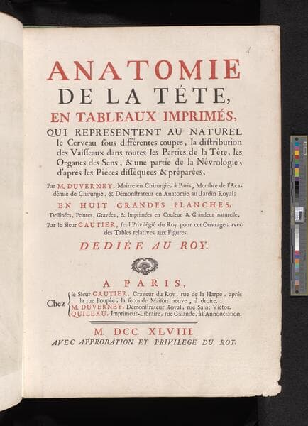 Anatomie de la tête, en tableaux imprimés, : qui representent au naturel le cerveau sous différentes coupes, la distribution des vaisseaux dans toutes les parties de la tête, les organes des sens, & une partie de la névrologie; d'après les piéces disséquées & préparées / par M. Duverney, maître en chirurgie, à Paris, membre de l'Académie de chirurgie, & démonstrateur en anatomie au Jardin Royal; en huit grandes planches, dessinées, peintes, gravées, & imprimées en couleur & grandeur naturelle, par le sieur Gautier, seul privilégié du Roy pour cet ouvrage; avec des tables relatives aux figures