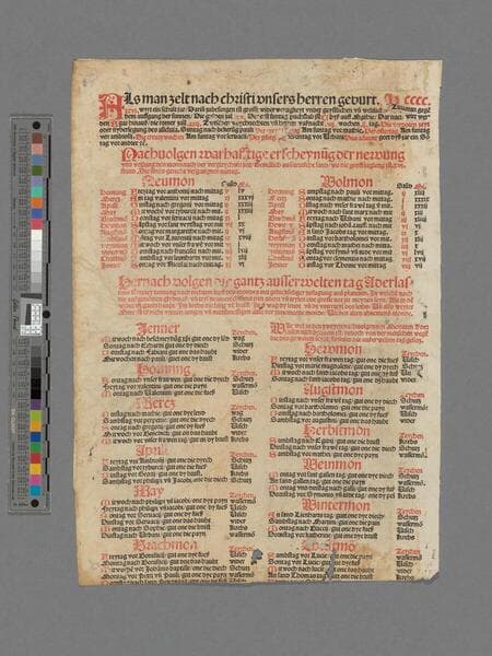 Almanac in German for 1487; includes information on when to perform bloodletting. Text begins: Im jar als man zalt nach Christi geburt M°cccc°lxxxvii° ... Woodcut banderole in top margin and woodcut border at left. Two astronomical illustrations. Imperfect: torn and repaired along previous center fold, with some loss of text. Previously mounted on a leaf.