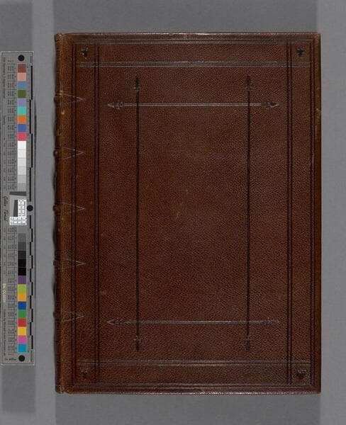 "On the recto of the last leaf is the register; and a device wherein (as well as in many other portions of the work) the name of Blastus occurs in the Greek character."--British Library. Printed in red and black. Signatures (in Greek characters): A-L⁸ M¹⁰ N⁸ X⁶ (A1 blank). Initial and border of each new section of text have additional red, green and gold ink flourishes. Woodcut image of Galen in center of top border on leaf A2r hand-colored. Binding: Greek-style bookbinding, probably sewn in the genuine way, i.e. with thread only (unsupported structure); spine is smooth and has a round shape, and is covered with overall textile lining outside of boards. The endbands are in the Greek style, extending onto the boards and sewn into them. Beech boards, with grooves running over corners, with full size reddish brown tanned goatskin cover, tooled in blind all over (frames) with small tools and fillets. Spine tooled in blind with fillets.