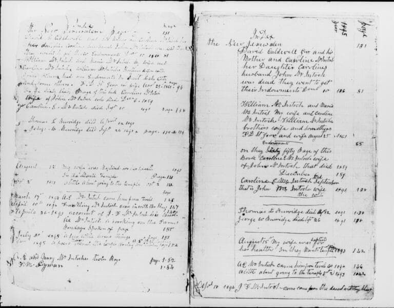Microfilm of George Laub's diary covering approximately 1845-1857, and identified as Volume 1. The volume is a mixture of autobiography and diary entries, many of which appear to have been copied from an earlier source. The first entry is dated January 1, 1845, but entries before about 1855 are not always in chronological order. The early portion of the volume consists of an autobiography recounting Laub's difficult childhood following the death of his father, his arrival in Nauvoo in 1843, the death of Joseph and Hyrum Smith, the expulsion of the Mormons from Nauvoo, Laub's adoption by John D. Lee, and his marriage to Mary Jane Meginness(who converted to Mormonism before their wedding); a combination of diary entries and autobiographical notes cover his moves between Illinois and Iowa from 1846-1847, persecution and mob violence faced by the Mormons in Illinois, his life in Missouri from 1848-1852, and his overland travels to Utah in 1852. The diary entries from 1855 focus on Laub's laboring on mills and his church activities in and around Salt Lake City through 1857. The volume also contains lists of births and deaths, as well as extensive theological notes, addresses, and prophecies copied from Joseph Smith, Hyrum Smith, Heber Kimball, and Brigham Young.