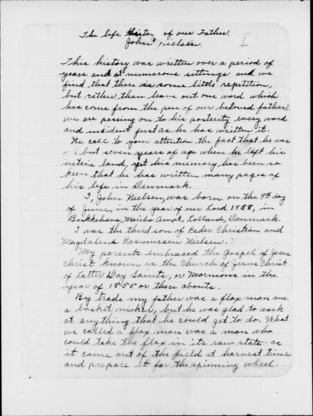 Typescript of John Nielsen's life history, probably recorded in or around 1885. The volume traces Nielsen's childhood experiences in Denmark, including prejudices faced by Mormon converts, and his family's plan to travel to the United States in 1866. It continues with notes on their voyage to New York, their travel by rail and boat to Florence, Nebraska, and their journey on foot to Salt Lake City. It concludes with reminiscences on Nielsen's life in Utah, including a grasshopper invasion in 1869.