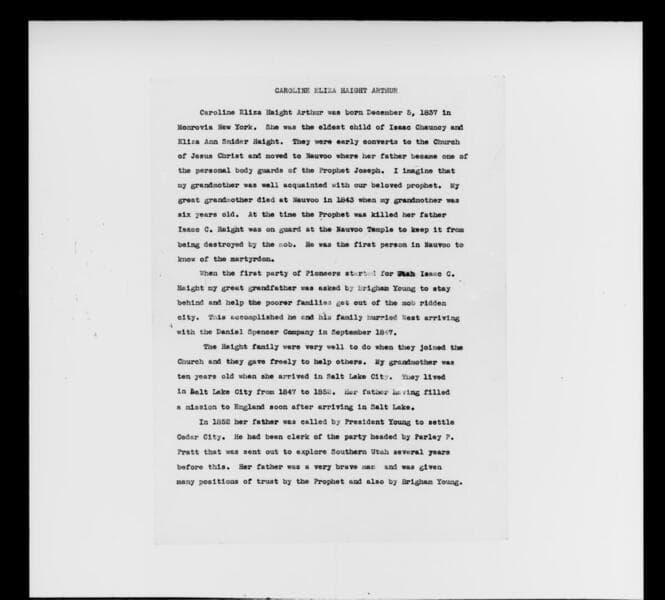 Microfilm of typed biographies on and diary entries made by Isaac Chauncey Haight. Opens with a biography of Haight by William R. Palmer entitled "Men You Should Know: Isaac C. Haight" (typescript of a radio talk given by Palmer over K.S.U.B. in Cedar City, Utah, on July 18, 1943); "The Old Virgin Ditch," a poem by Mable Jarvis; and a brief account entitled "Thales Haskell describes the Tragedy of death of George A. Smith fall 1860." The majority of the reel is the Biographical Sketch and Diary of Isaac Chauncey Haight, 1813-1862, a typescript copied by Brigham Young University in 1940. It includes a brief biography of Haight as well as his diary entries for his 1850-1853 mission to England (including accounts of his overland travel to and from Utah) and some various diary entries made in Utah from 1853-1862. Also includes an index of names and family photographs.