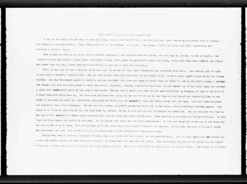 Microfilm of a typescript of Solomon Chamberlain's brief autobiography, written in 1858. It covers his childhood in Connecticut, his living of a "very wicked life" following his father's death, his search for redemption in religion and joining of the Methodist Order around 1815, a long account of his conversion to Mormonism in 1830, his travels attempting to sell the Book of Mormon and his belief that he could convince the "Reformed Methodists" of its "truth," his move to Missouri in 1831 and departure following mob violence, his life in Nauvoo to 1847, his travels to and from Utah and Council Bluffs, his gold mining trip to Sacramento, and many references to his ill health.