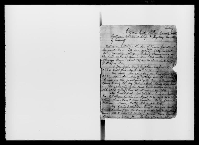 Microfilm of the autobiography of William Decatur Kartchner through about 1881. It covers his early life and family history, conversion to Mormonism, living in Nauvoo, traveling overland to Utah, living in Snowflake, various family illnesses, a biographical sketch of Father Henry Gale, and a detailed genealogical account.