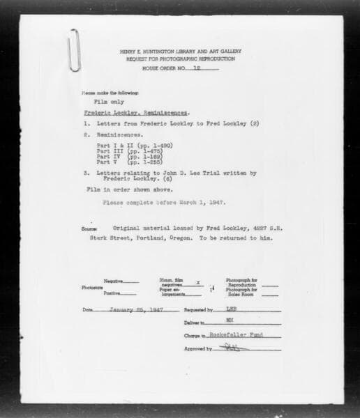 The collection consists of the papers of Frederic E. Lockley (1824-1905) and his son, Fred Lockley (1871-1958).
