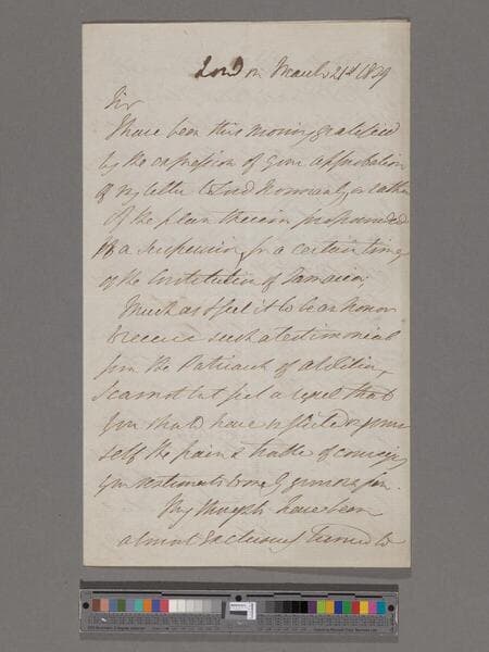 [Browne, Howe Peter, 2d Marquis of] Sligo. Letter to [Thomas Clarkson]