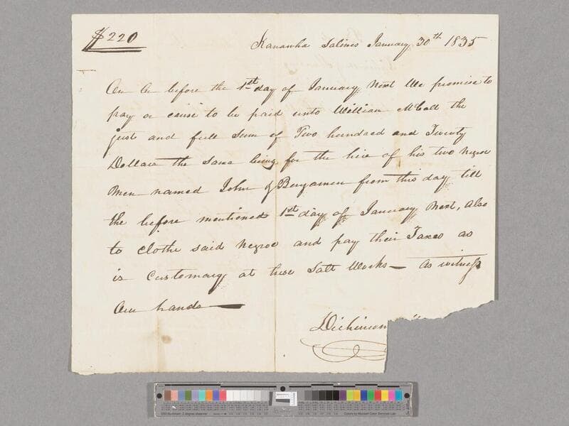 The Dickinson & Shrewsbury records contain personal and business correspondence related to Dickinson & Shrewsbury salt mine company, their business and legal records, and files related to the enslaved labor that the company used in their salt mines including the family of Booker T. Washington, who were enslaved by the Ruffner family. The correspondence series, 1799 to 1880, is mostly between prominent company members and family members. The business files series, 1801 to 1857, are made up of financial accounts for the company. The enslaved labor files, 1806 to 1863, contain a variety of documents related to the enslaved people the company "hired out" from other enslavers to work at the salt mines. Many of the documents of the collection are the result of the dissolution of the company and the many lawsuits that were brought about near the end of the company. The topic of the enslaved people the company used is present in each series. The records also relate to several other companies in the same region such as Joel Shrewsbury & Company, and Dickinsons & Shrewsbury. There are also two maps, 1838 and undated.