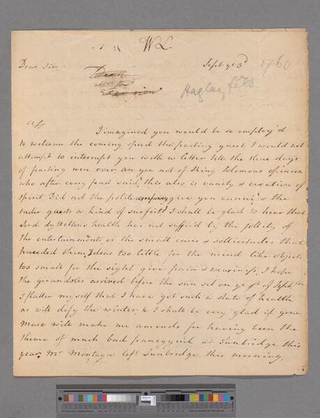 Montagu, Elizabeth (Robinson). Letter to Thomas Lyttleton, 2nd Baron Lyttleton of Frankley
