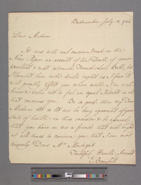 Somerset, Elizabeth (Berkeley), Duchess of Beaufort and suo jure Baroness Botetourt. Letter to Elizabeth (Robinson) Montagu