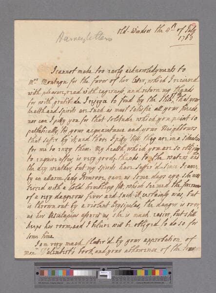 Hervey, Mary (Lepell), Baroness Harvey of Ickworth. Letter to Elizabeth (Robinson) Montagu