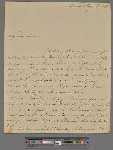 Petty, Sophia (Cateret), Countess of Shelburne. Letter to Elizabeth (Robinson) Montagu