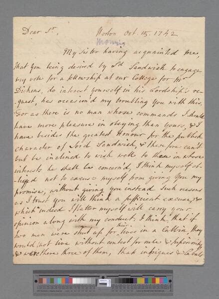 Robinson-Morris, Matthew, 2nd Baron Rokeby. Letter to Elizabeth (Robinson) Montagu