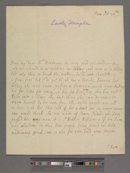 Grenville-Temple, Anna (Chambers), Countess Temple. Letter to Elizabeth (Robinson) Montagu