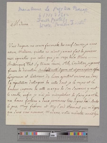 Du Boccage, Marie Anne (Le Page) Fiquet. Letter to Elizabeth (Robinson) Montagu
