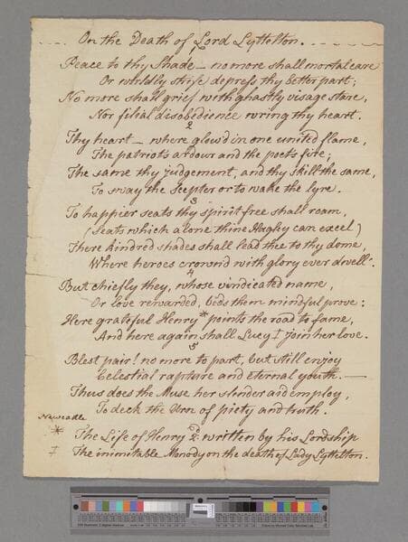 [Unknown author]. One the Death of Lord Lyttleton: [a poem in 5 stanzas of 4 lines each]