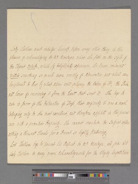 Pitt, Hester (Grenville), Countess of Chatham & suo jure Baroness Chatham. Letter to Elizabeth (Robinson) Montagu