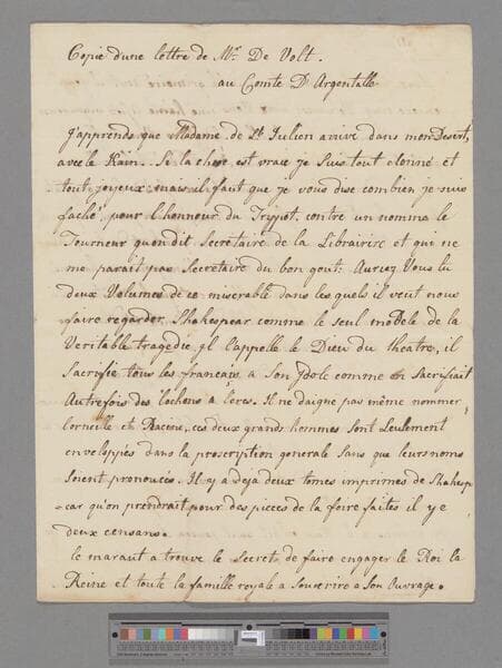 Voltaire, Francois Marie Arouet. Letter to Charles Augustin Ferriol, Comte d'Argental
