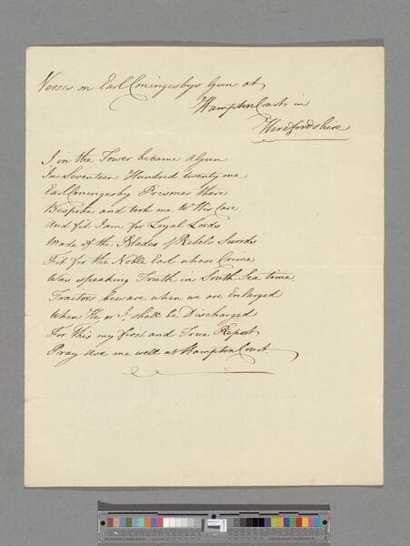 [Unknown author]. Verses on Earl Coningesby's Gun at Hampton Court in Herefordshire: [a poem of 12 lines]
