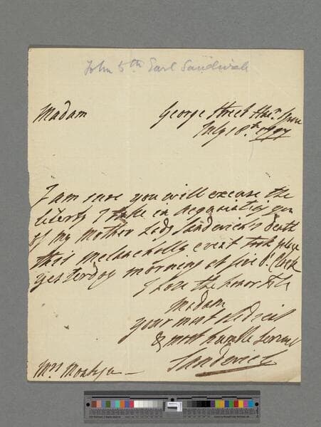 Montagu, John, 5th Earl of Sandwich. Letter to Elizabeth (Robinson) Montagu