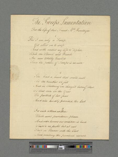 [Unknown author]. The Sweeps Lamentation For the loss of their Friend Mrs. Montague: [a poem in 5 stanzas of 6 lines each]