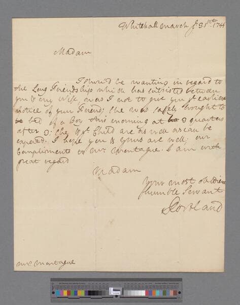 Bentinck, William, 2nd Duke of Portland. Letter to Elizabeth (Robinson) Montagu