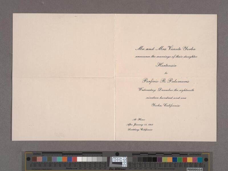 Items related to Graciosa Vejar; Mr. and Mrs. Francisco Zoilo Vejar and Francisca (Yorba) Vejar's marriage announcement for their daughter Graciosa Vangelin to William Merrill Pipkin, 1917.