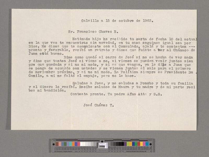 Letter from José Chávez Torres (Calvillo, Aguascalientes) to Paco Chávez Esparza (San José, California)