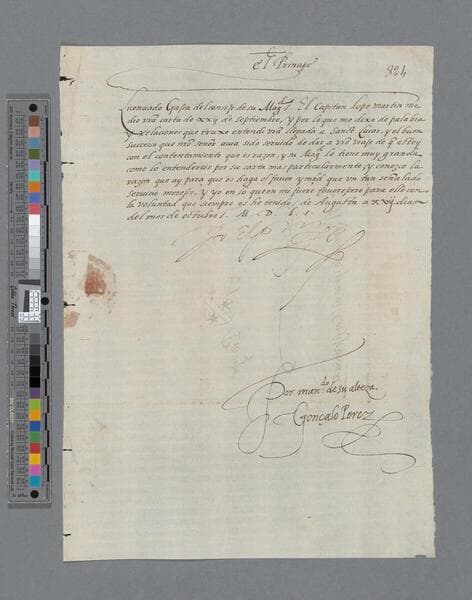 Felipe II, King of Spain, letter to Pedro de la Gasca, Bishop