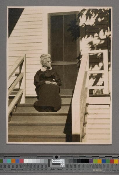 Charmian London stands with a horse outside the cottage at Beauty Ranch. Jack London is partially visible sitting on the porch steps behind her.