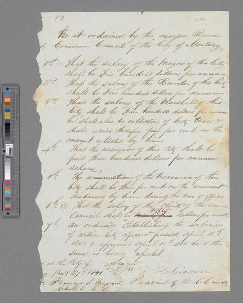 The collection consists of letters and documents related to the government of the municipality of Monterey, primarily during the period 1828-54. The collection also includes minute books, election results, and records of disbursements of funds and of ordinances passed. Most of the documents are in Spanish until 1846, and in English thereafter.