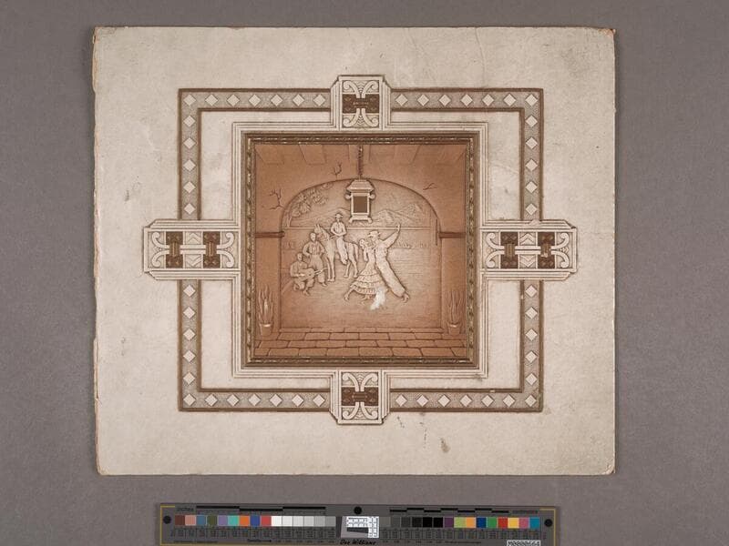 Lugo family papers, box 8, folder 1, Embossed leather photo album cover with image of dancers and man on horseback undated
