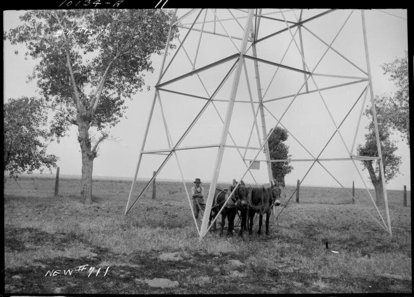 Big Creek T/L Right of Way at Mile 145 - Tower 3. In connection with Tejon Ranch condemnation suit. D.M. Gutheridge plowing in the field under Mile 145 - Tower 3 West line with a team of 3 horses, near Bakersfield on land belonging to T.P. Chinette - Sec 2.4 T. 30 S., R. 28 E., M.D.M.