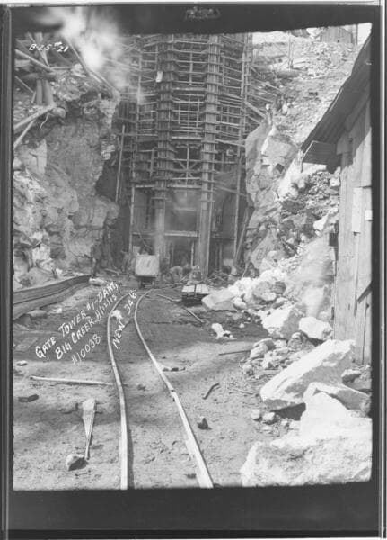 Big Creek - Face of Dam #1 Huntington Lake - Showing construction work on Intake Tower and construction trestle for Dam#1.