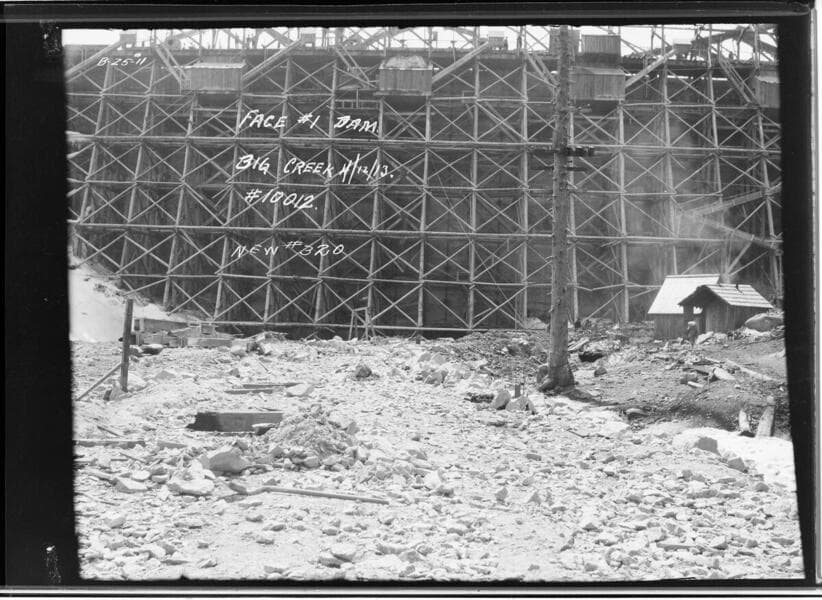 Big Creek - Huntington Lake - Face of Dam #1. Showing trestle used during constrution.