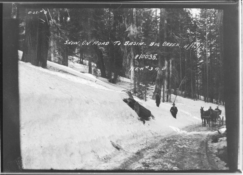 Big Creek Miscellaneous - Horse drawn carriage in the snow with 3 people on road from Powerhouse #1 to Huntington Lake.