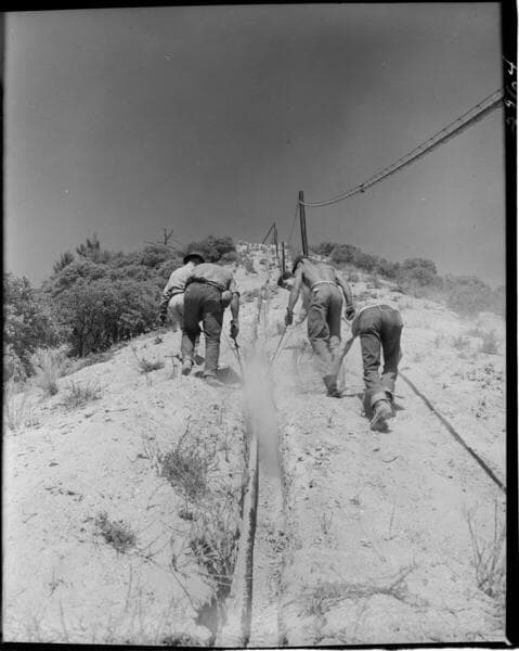 Distribution - Underground - Mt. Wilson - man looking down hill along trench.