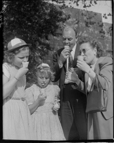 A view of a man with an ice cream container on his head and two boys next to him eating ice cream.
