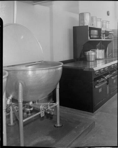 Commercial Cooking - copy negatives, chef tipping kettle into skillet.