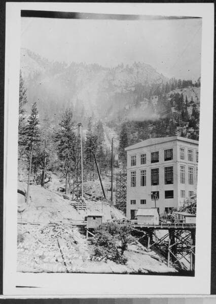 Big Creek Powerhouse #1 - Early stages of construction during the framing stages, taken from hillside at N. W. corner of building, showing concrete forms, reinforcing steel, etc.