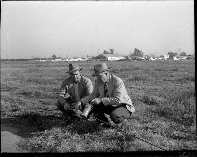 Commercial Lighting - Airport installation, 3 men examine marker - Fullerton.