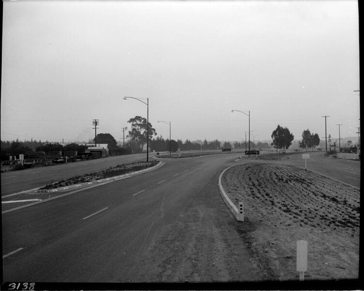 Street lighting over a divided highway bridge