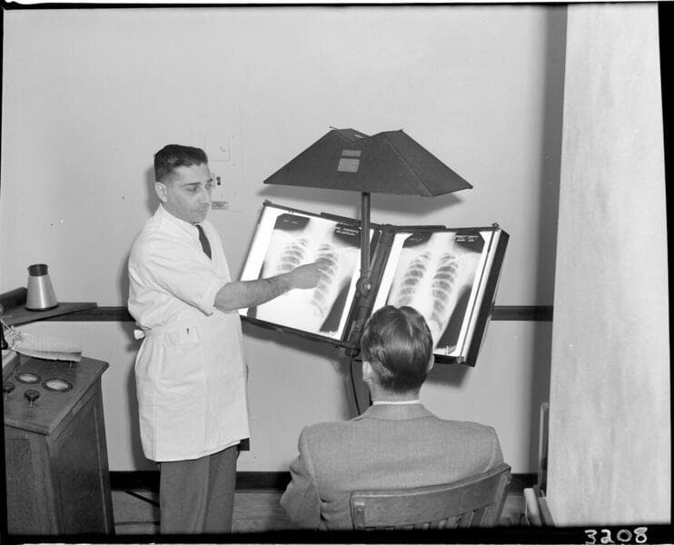 Medical Dept. - Chief Surgeon, F. X. Amwann talks with patient.
