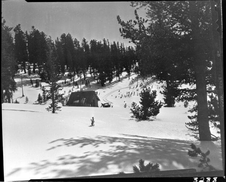Big Creek snow survey. Sno-cat parked beside shelter cabin. Kaiser Meadow