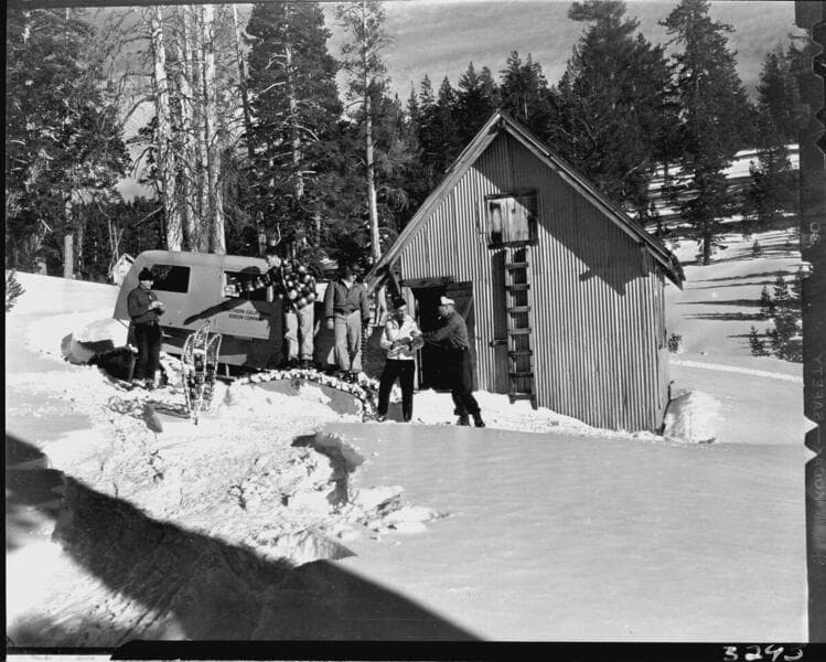 Big Creek snow survey. Sno-cat parked beside shelter cabin. Kaiser Meadow