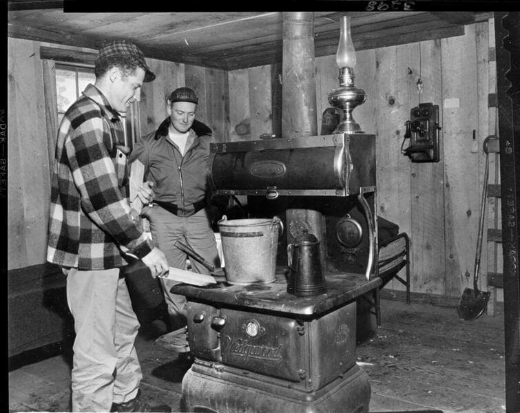 Two men in Kaiser Meadow shelter cabin used during snow surveys. One is pouring a cup of coffee from the wood-burning stove, while the other is checking out the canned food supplies in a large pantry.
